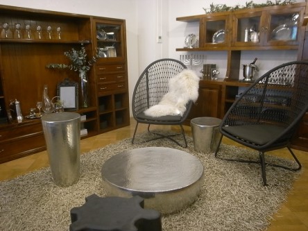 ショールームでは、シルバー色のテーブル(CAIRO)や黒革のソファー(GIACOMO)