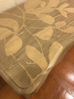 柄の部分は光沢が少しあるツルッとした仕上げになっており、天板本体はザラッとしたサンドブラスト加工になっています。 |