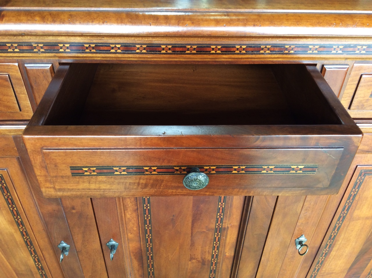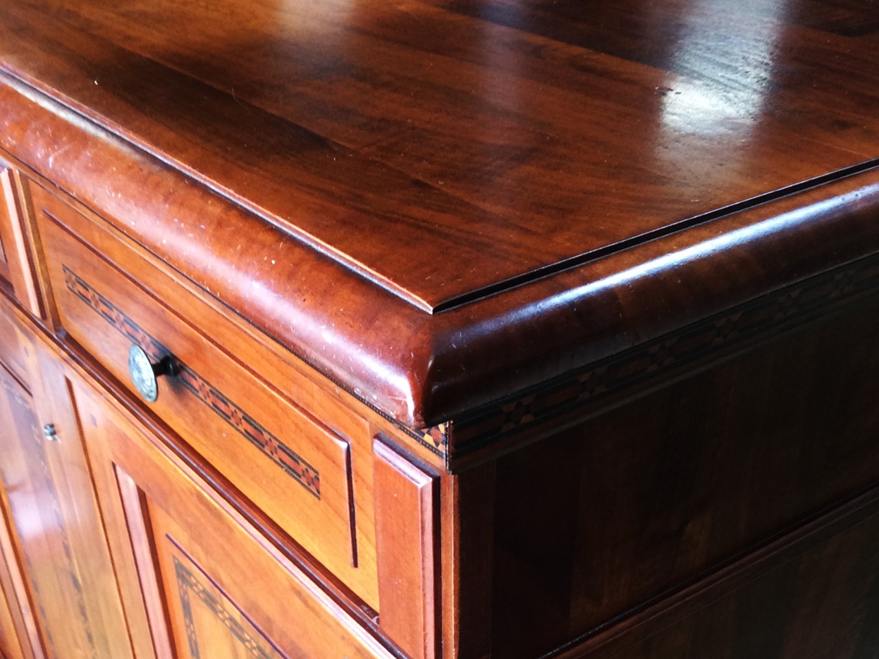 ウォールナット等の無垢材に、職人の手作業で様々な色合いの木をはめ込んで