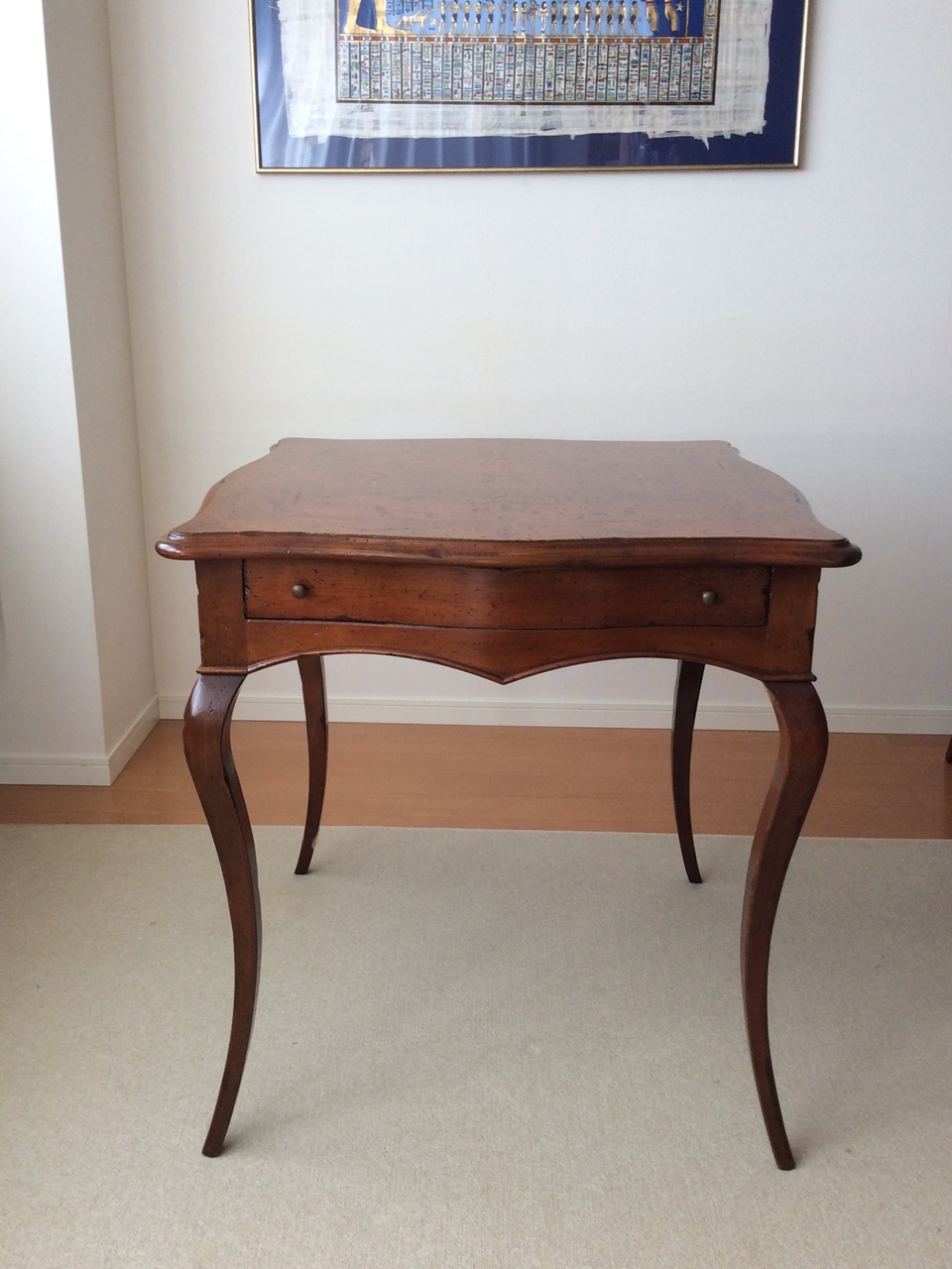 ウォールナットの落ち着いた木の色目、テーブルの美しい象嵌模様が目を引きます。