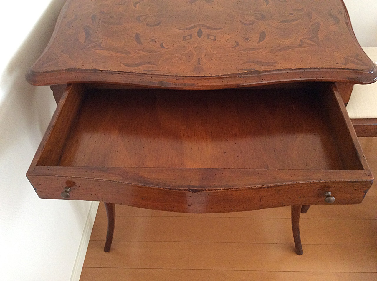 天板全体に施されたクラッシックな模様は、職人が一つ一つの異なる木の色のパーツを