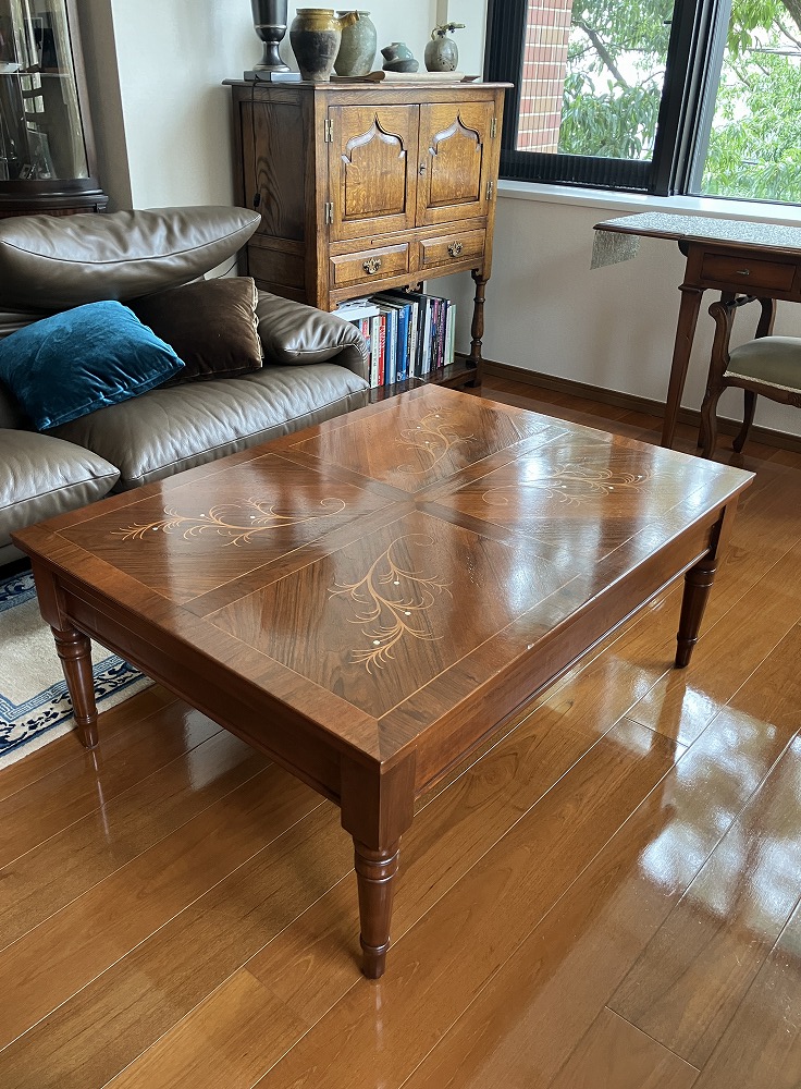 ウォールナット無垢材の天板に繊細な象嵌細工が施されたセンターテーブルです。