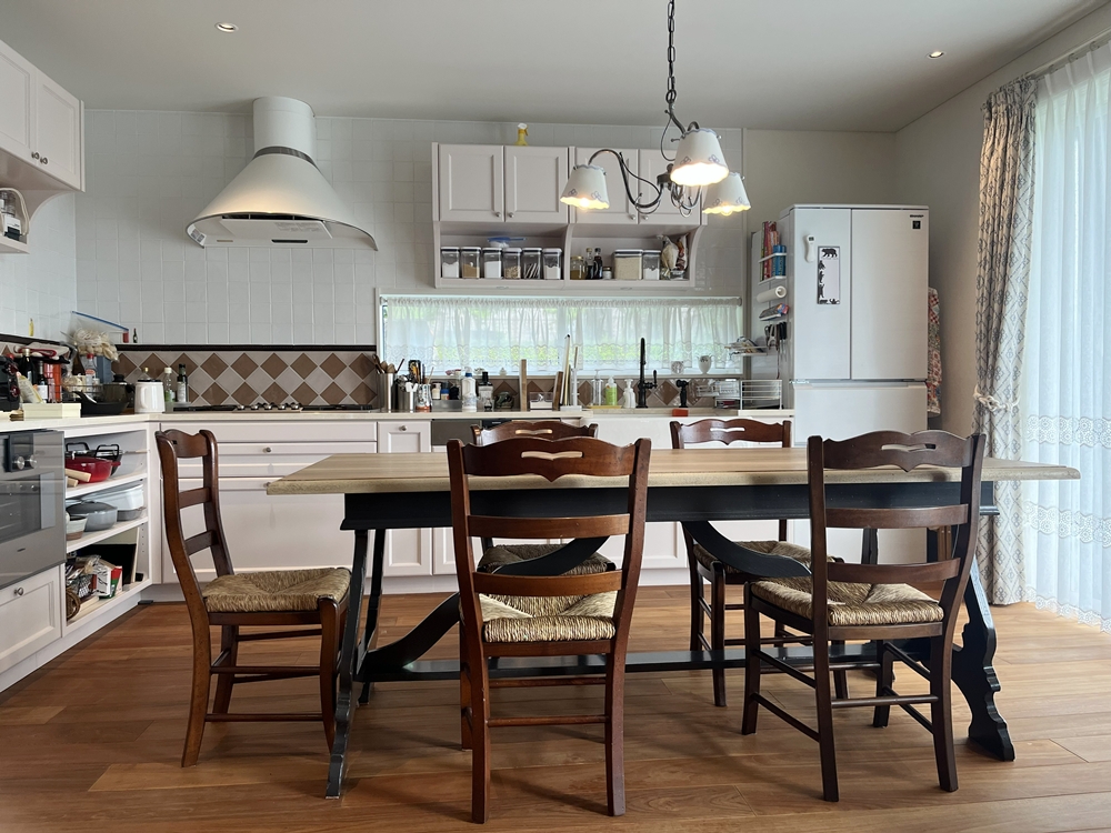 一階にあるお母様お住まいのダイニングルーム。キッチンと壁は白系、チェリー材の床で