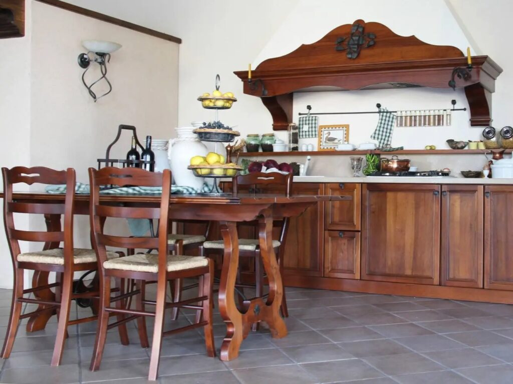 イタリアを思い起こすテラコッタの床と木のキッチン、照明が家具を優しく照らしています。