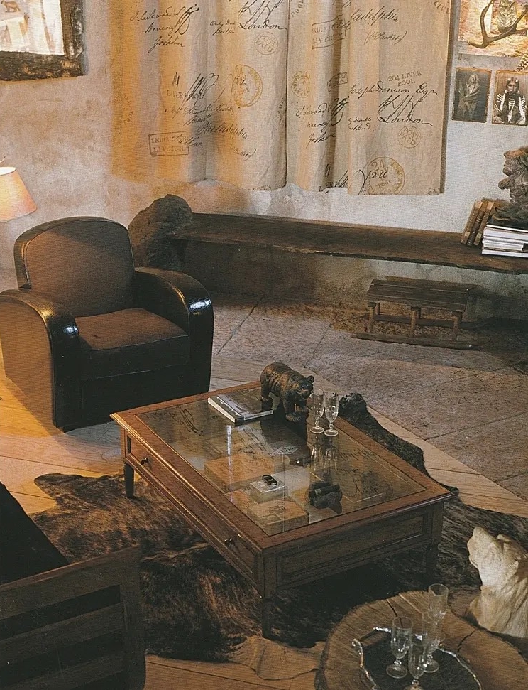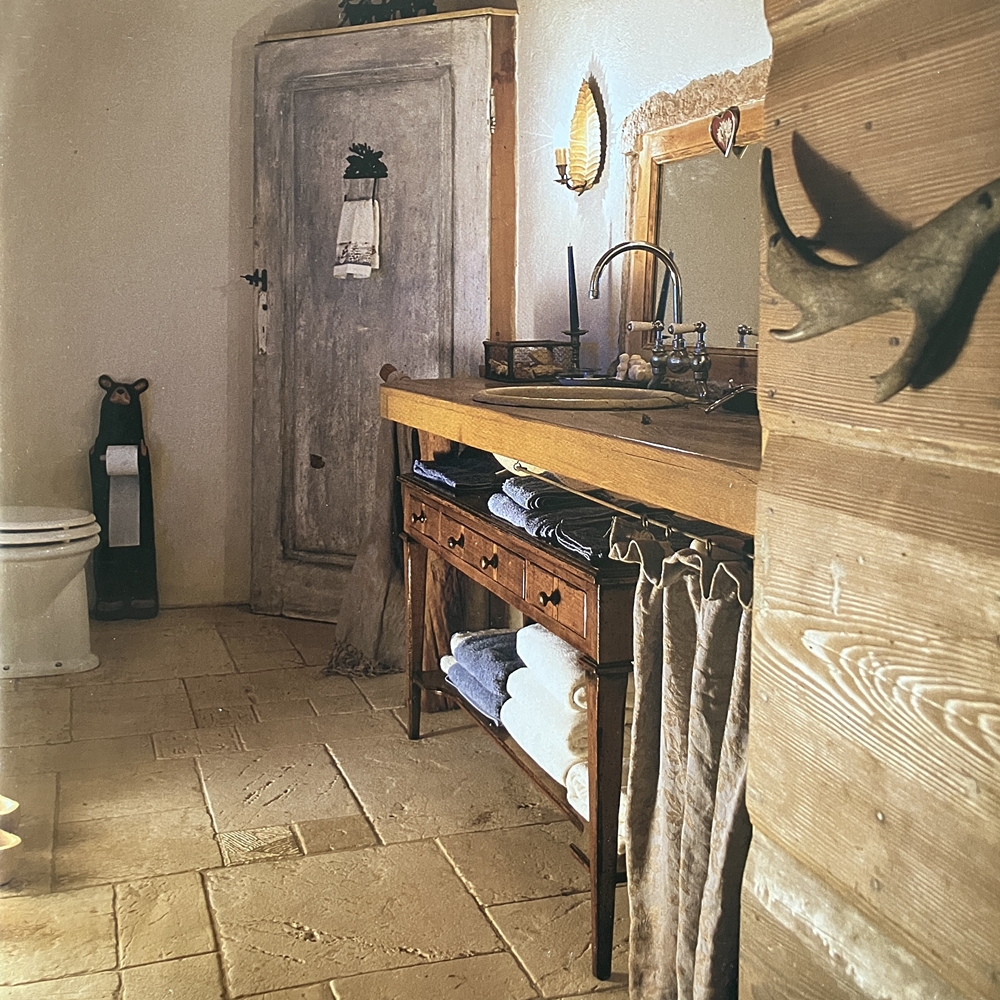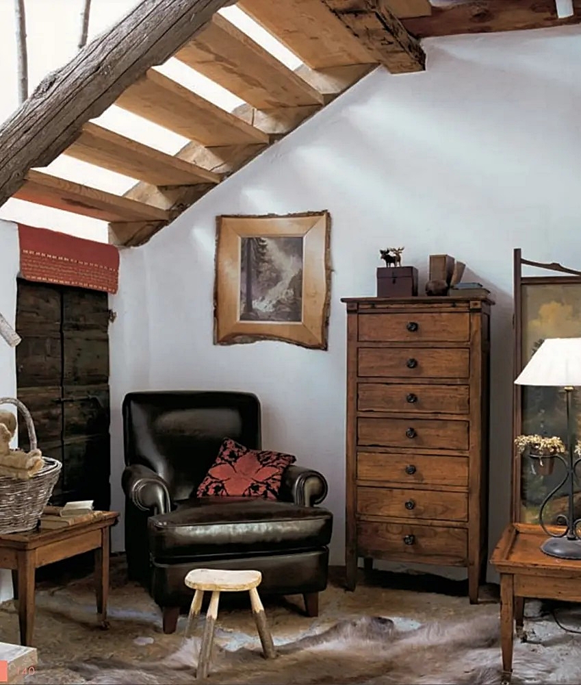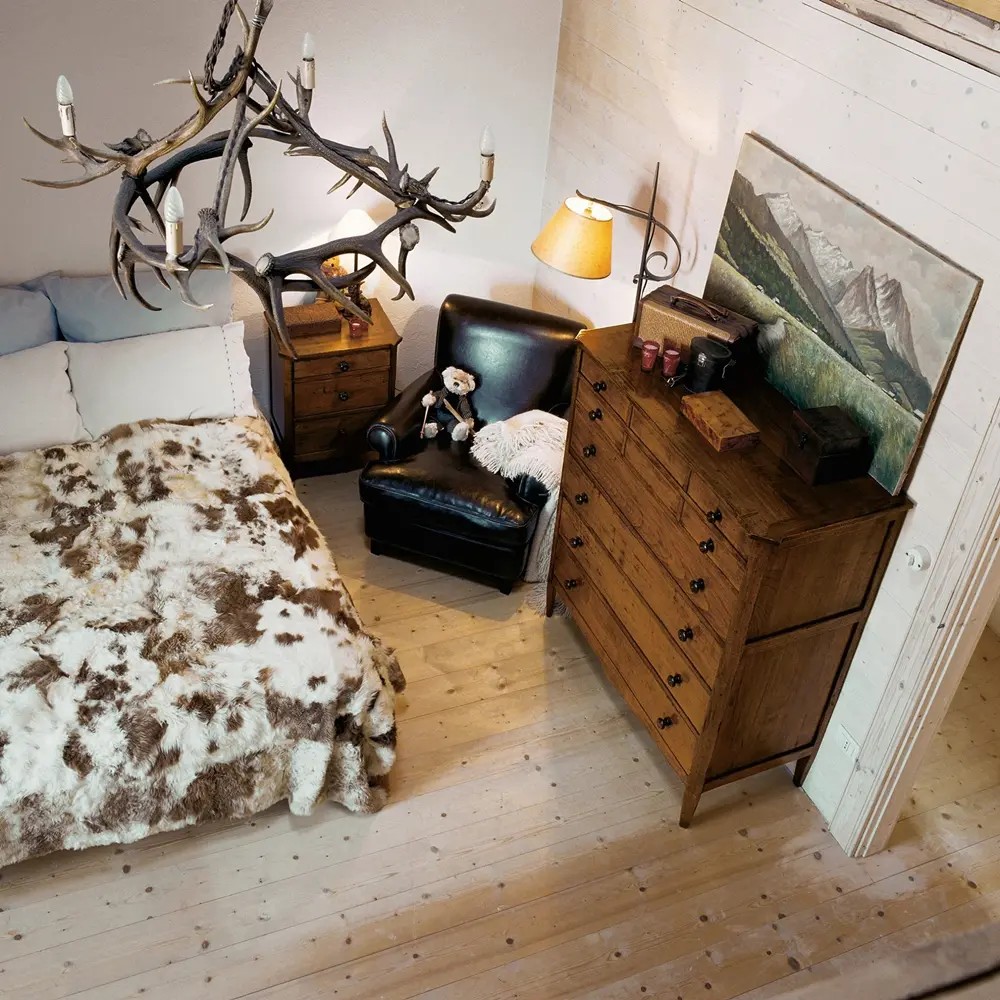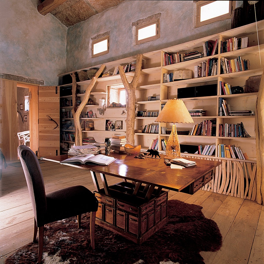 山小屋風の内装材にも合うマルケッティ家具の数々。